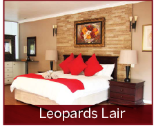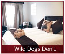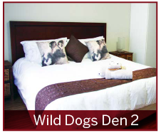 We offer 4 luxury rooms, three main on suite double rooms (Leopards Lair, Wild Dogs Den 1 and Jackals Cottage) and one double room (Wild Dogs Den 2) with access to a shared bathroom, ideal for family groups of 4. Two of the mains (Leopards Lair and Jackals Cottage) are family rooms that have an extra double sleeper couch allowing for the easy occupancy of 4 guests per room.