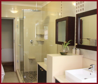 Spacious open plan luxury on suite bedroom with a garden view. This executive room has a luxurious bathroom, with an inside shower, a large cornered bathtub, his and hers basin area and a large private outdoor shower. It has a super king size extra length bed and an extra double sleeper couch, making it a comfortable family room for 4 guests. This main room has an air conditioner, a Big screen smart TV with entertainment channels, tea/coffee station, safe oil heaters (for winter use only), reading area and FREE WiFi, with private access to the garden and pool area.